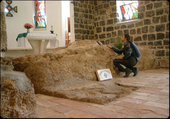 Beside Jesus' table in Church of Peter's Primate, Tabgha.